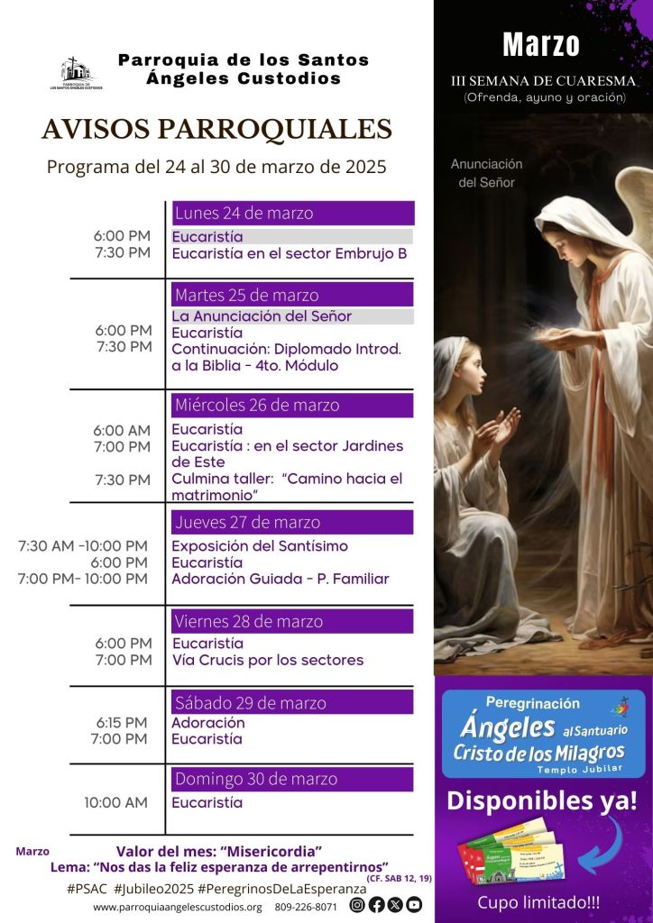 Contenido publicado originalmente en los canales de la Parroquia De Los Santos Ángeles Custodios, PSAC, por la Pastoral Digital, bajo el link:  http://www.parroquiaangelescustodios.org – Puede copiar esta información en su Blog citando siempre la referencia a esta fuente consultada. Para compartir en sus redes sociales, utilice los botones compartir. Conozca términos legales – Pastoral Digital PSAC