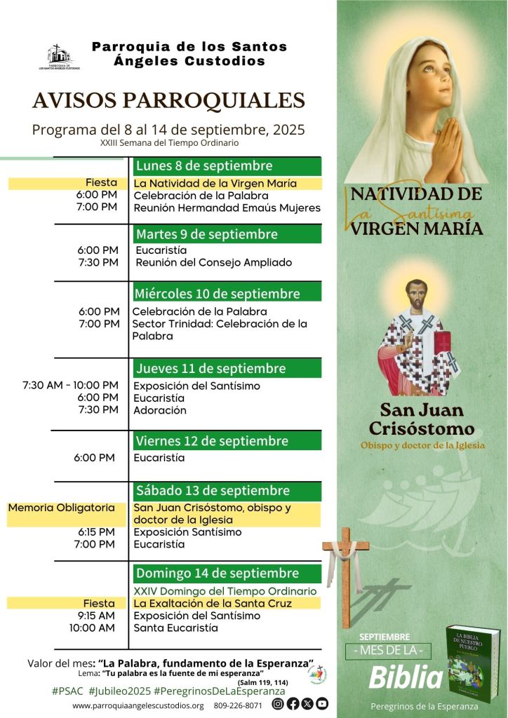 Contenido publicado originalmente en los canales de la Parroquia De Los Santos Ángeles Custodios, PSAC, por la Pastoral Digital, bajo el link: http://www.parroquiaangelescustodios.org – Puede copiar esta información en su Blog citando siempre la referencia a esta fuente consultada. Para compartir en sus redes sociales, utilice los botones compartir. Conozca términos legales – Pastoral Digital PSAC