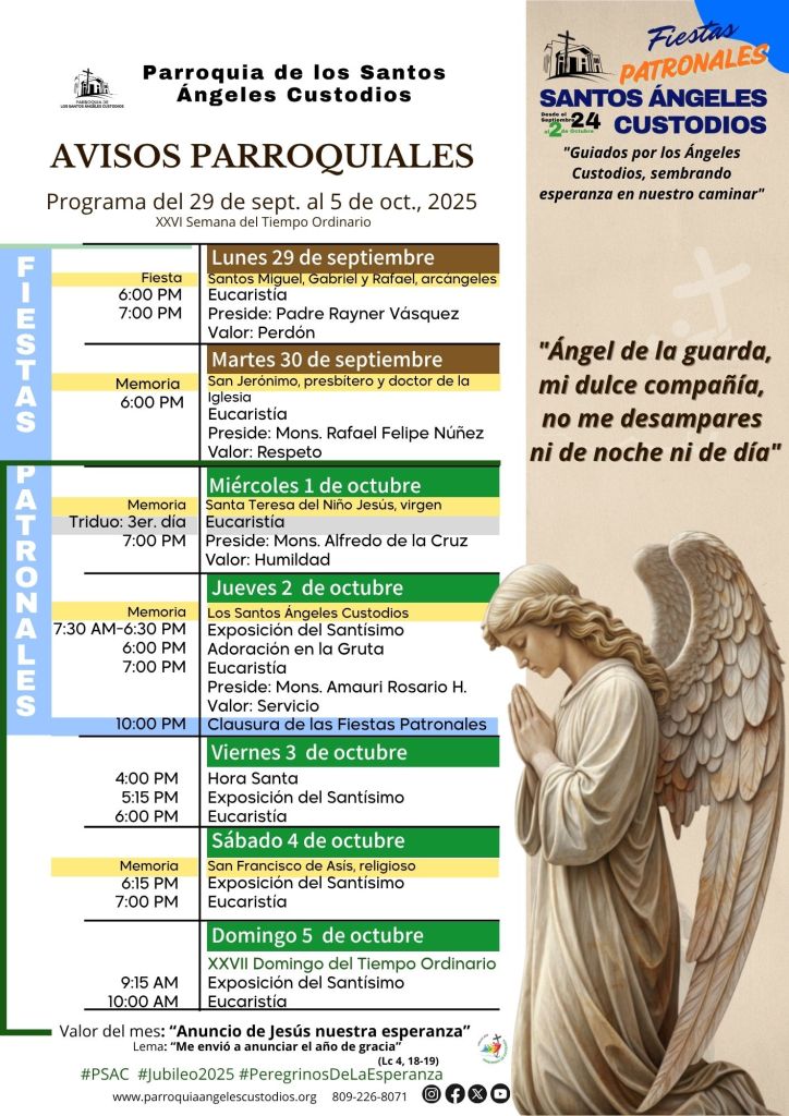 Contenido publicado originalmente en los canales de la Parroquia De Los Santos Ángeles Custodios, PSAC, por la Pastoral Digital, bajo el link: http://www.parroquiaangelescustodios.org – Puede copiar esta información en su Blog citando siempre la referencia a esta fuente consultada. Para compartir en sus redes sociales, utilice los botones compartir. Conozca términos legales – Pastoral Digital PSAC